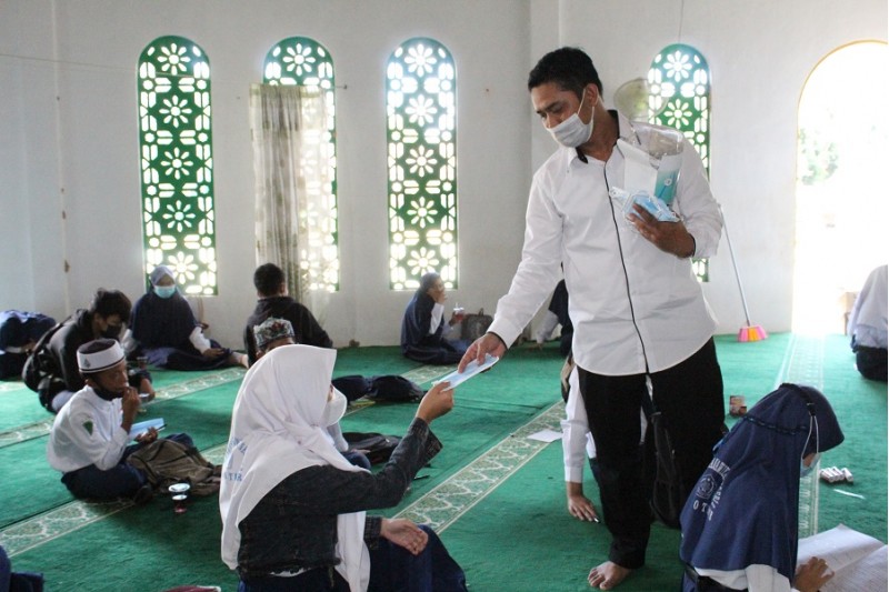 Kegiatan ini dilakukan di mushola sekolah dengan tetap menjaga jarak dan menerapkan protokol kesehatan dengan ketat, demi menekan angka penyebaran virus covid - 19 saat ini (Humas).