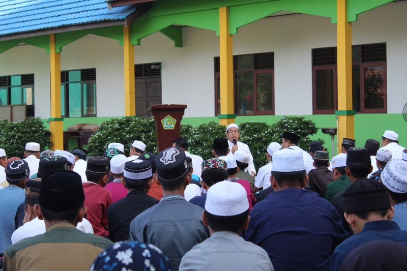 Kegiatan ini dilaksanakan di ruang terbuka dengan siswa dan guru membawa sajadah masing-masing (Humas).
