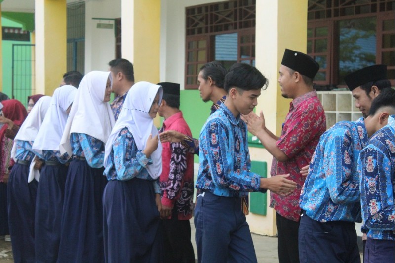 Seluruh siswa berbaris dan secara bergiliran melakukan salaman dengan kepala madrasah dan dewan guru beserta staff, tidak lupa juga mereka saling bersalaman sesama siswa madrasah.
