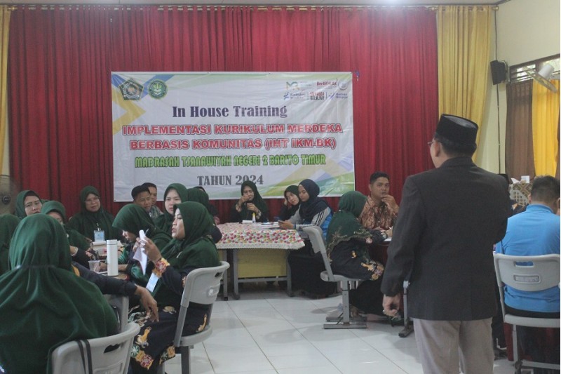 Ampah, 20/07/2024 (Humas) Pelaksanaan In House Training (IHT) Implementasi Kurikulum Merdeka Berbasis Komunitas (IKM-BK) yang dilaksanakan di ruang Smart Class MTsN 2 Barito Timur mulai tanggal 19 s.d 20 Juli 2024. Kegiatan ini dihadiri sebanyak 37 peserta yang terdiri dari tenaga pendidik MTsN 2 Barito Timur sebanyak 33 orang, MTs Syiarul Islam 1 orang, MTs Islamiah 1 orang, dan MTs Mathla'ul Anwar 2 orang. Bapak Dr. M. Saufi Rahman, M.Pd selaku fasilitator yang diudang untuk memberikan materi terkait penerapan Implementasi Kurikulum Merdeka Berbasis Komunitas (IKM-BK) di MTsN 2 Bartim. Kegiatan ini juga dibuka secara resmi oleh Kasi Pendis Bapak H. Fatchur Rozi, S.Ag selaku perwakilan dari Kepala Kantor Kementerian Agama Kabupaten Barito Timur didampingi oleh Bapak H. Barkatullah Amin, S.Ag selaku pengawas madrasah jenjang MTs.
