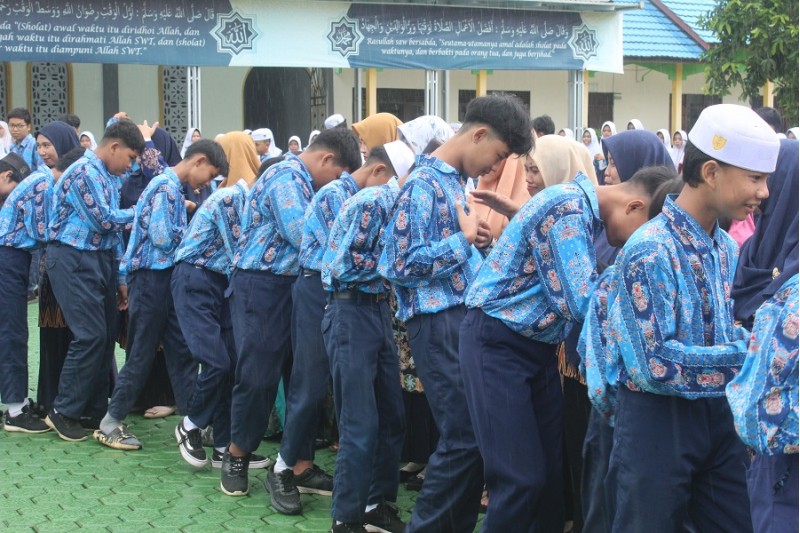 didik melaksanakan kegiatan salam-salaman di halaman Musholla Al-Ghazali MTsN 2